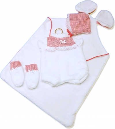 Dekoratyvinė paklodė su ausytėmis kartu su 3 dalių drabužėliais sukuria suderintą aprangą, kuri suteiks žaidimui su lėle naują dimensiją.