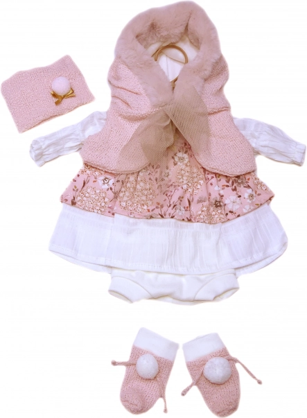 Rinkinyje yra suknelė, kepurėlė, lankelis, kojinaitės ir šalikas, kuriuos galima laisvai derinti.