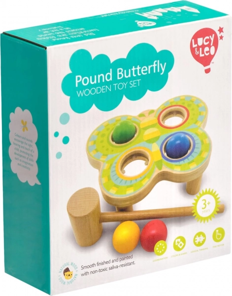 Šis kokybiškas medinis kalimo žaislas drugelio pavidalo pradžiugins vaikus linksmomis spalvomis ir išmania žaidimo idėja. Vaikas lengvai plaktuku trinkteli į spalvotus kamuoliukus, ir jie įkrenta į tokios pačios spalvos angas – taip lavinama koordinacija ir spalvų atpažinimas.