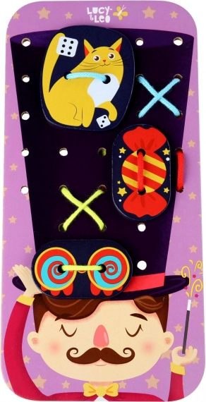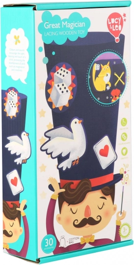 Atraskite kūrybišką Lucy & Leo medinį vėrimo rinkinį, kuris lavina smulkiąją motoriką, kūrybiškumą ir spalvų bei formų atpažinimą. Rinkinyje yra 31 medinis elementas, 4 spalvoti raišteliai ir didelė pagrindo plokštė su burtininku, prie kurios vaikai pagal fantaziją perveria ir tvirtina dekoracijas.