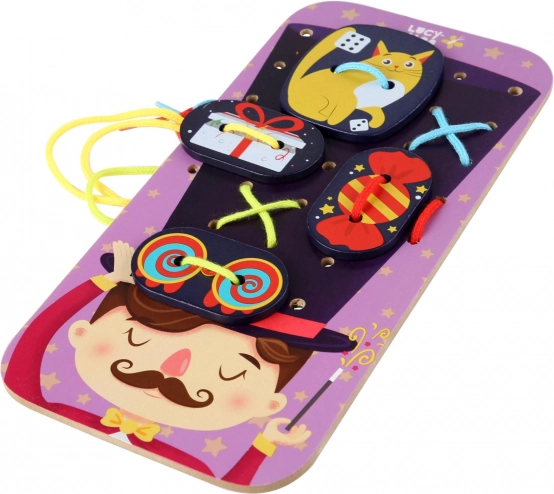 Šis smagus vėrimo ir pervėrimo rinkinys su burtininko motyvu kviečia vaikus į fantazijos pasaulį. Prie didelės plokštės su burtininko galva ir jo skrybėle vaikai gali raišteliais tvirtinti spalvingus priedus – nuo triušio ir monetų iki paslaptingų kortų. Žaisdami vaikai lavina akių–rankų koordinaciją, kantrybę ir kūrybiškumą.