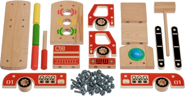 Surenkite funkcionalią medinę gaisrinę mašiną su varžtais ir įrankiais. Konstravimo procesas skatina loginį mąstymą ir kantrybę.