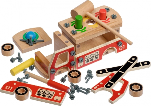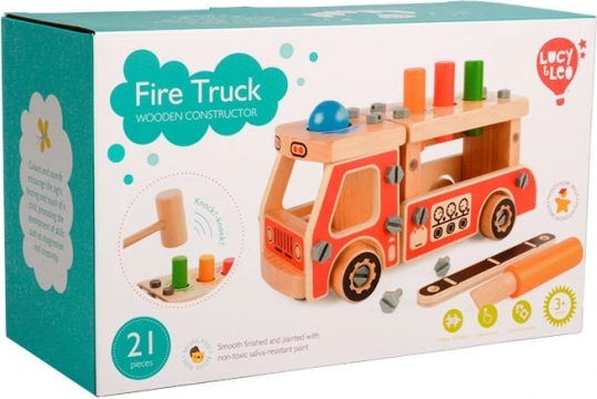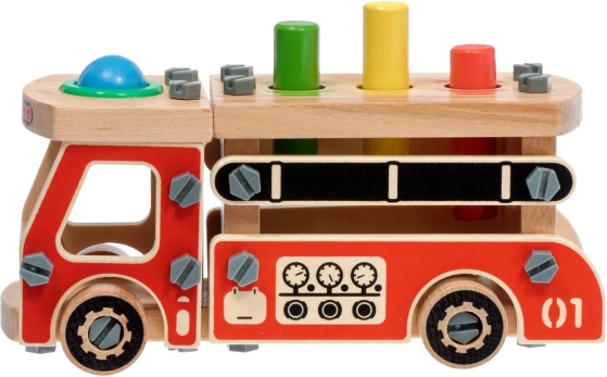 Šis kūrybinis rinkinys sujungia konstruktorių ir kaladėlių kalimo žaidimą viename. Vaikai pirmiausia surenka tvirtą medinę gaisrinę mašiną, o tuomet jos kėbule esančias keturias angas naudoja linksmam spalvotų elementų kalimui plaktuku. Ryškios spalvos ir įvairios formos skatina natūralų mokymąsi ir susikaupimą.