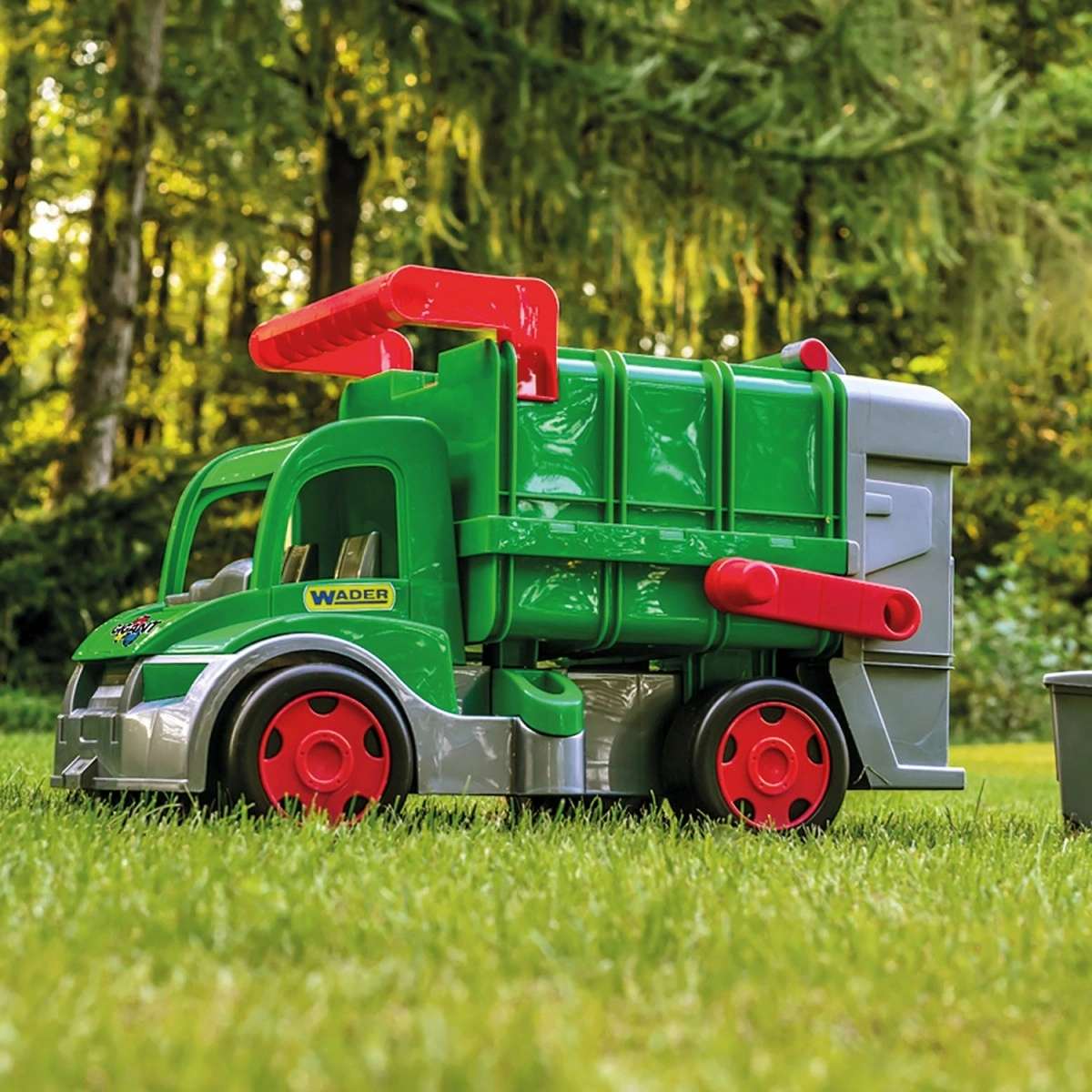 Šiukšlių vežimo automobilis WADER GIGANT FARMER suteikia vaikams realistišką miesto tvarkymo žaidimą. Dėl judančio keltuvo lengva ištuštinti pridėtą konteinerį, atidaromas galinis dangtis palengvina pakrovimą ir iškrovimą, o laisvai riedantys ratai užtikrina sklandų judėjimą. Iki 50 kg keliamoji galia leidžia vaikams atsisėsti ant automobilio ir laikytis už patogaus viršutinio laikiklio, o priekinis vilkties kabliukas suteikia galimybę vilkti ar sujungti su kitu transportu arba virve.