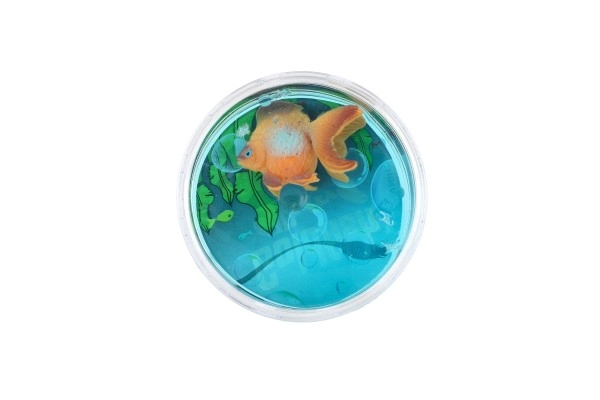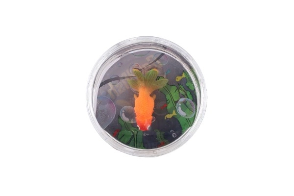 Kompaktiškas permatomas indelis su realistiškai atrodančia žuvyte ir dekoratyviniais elementais vizualiniam malonumui.