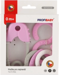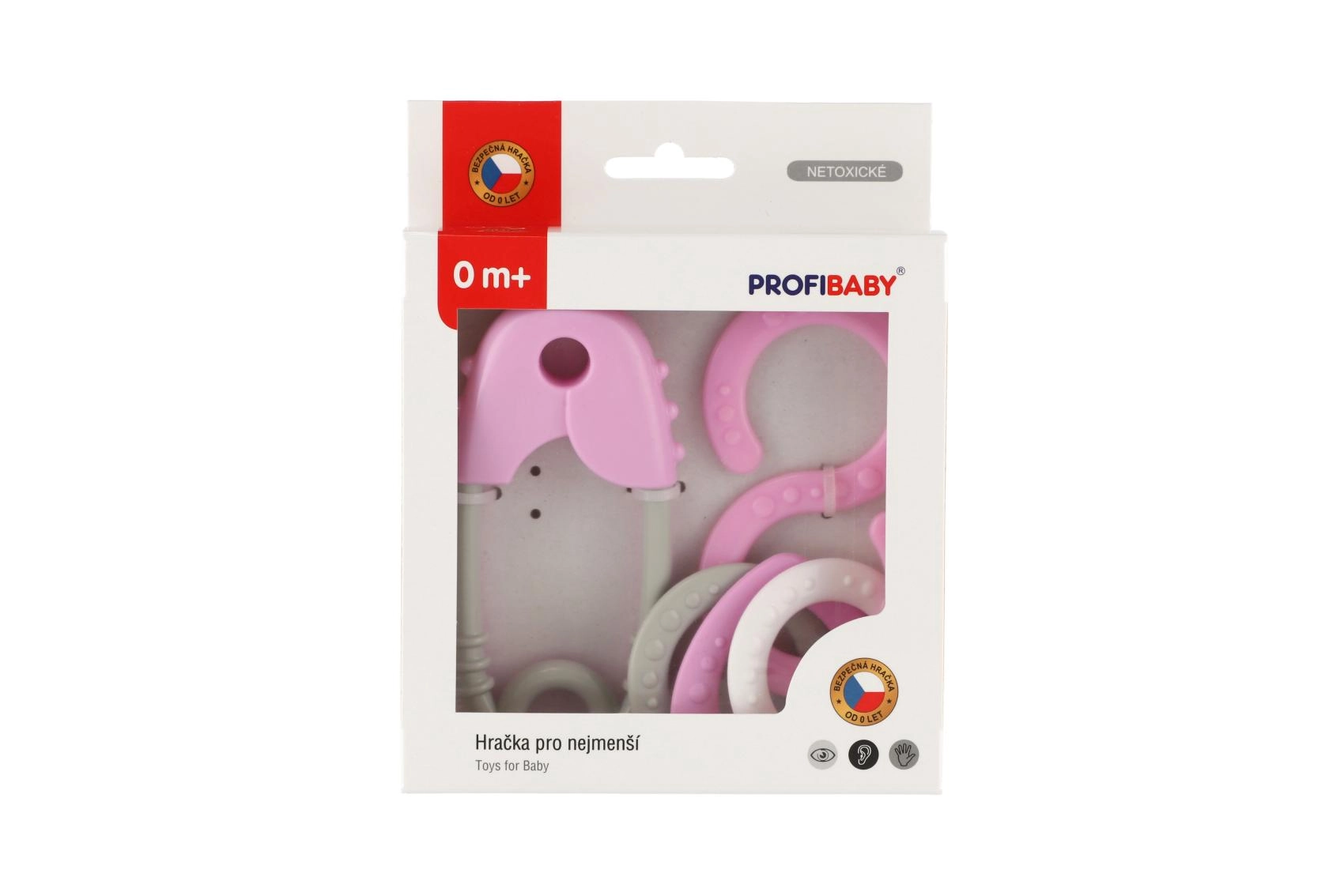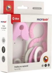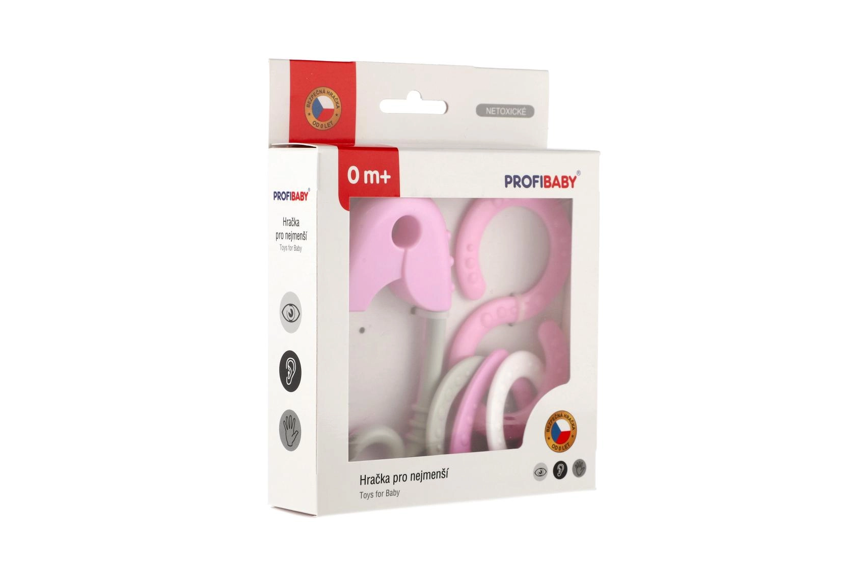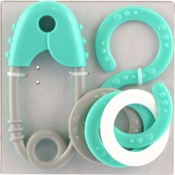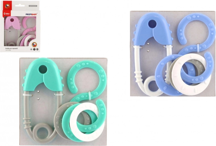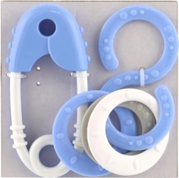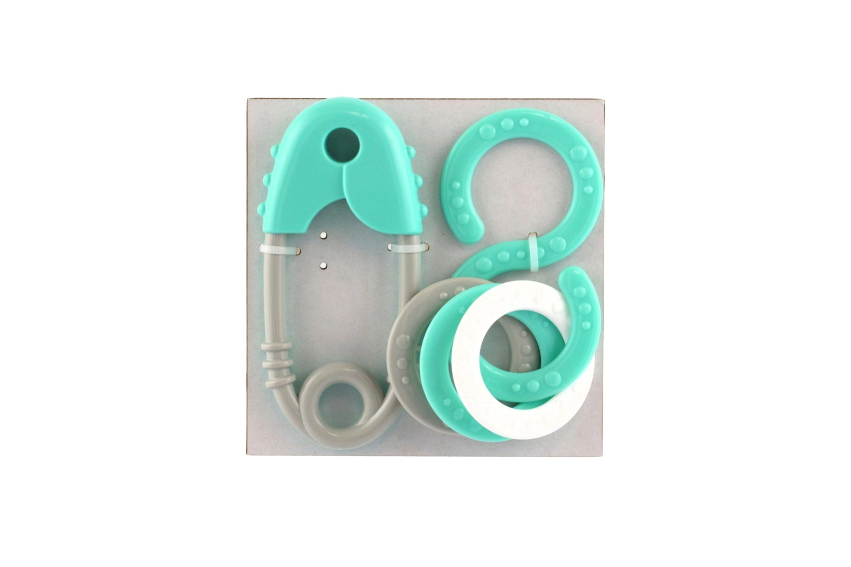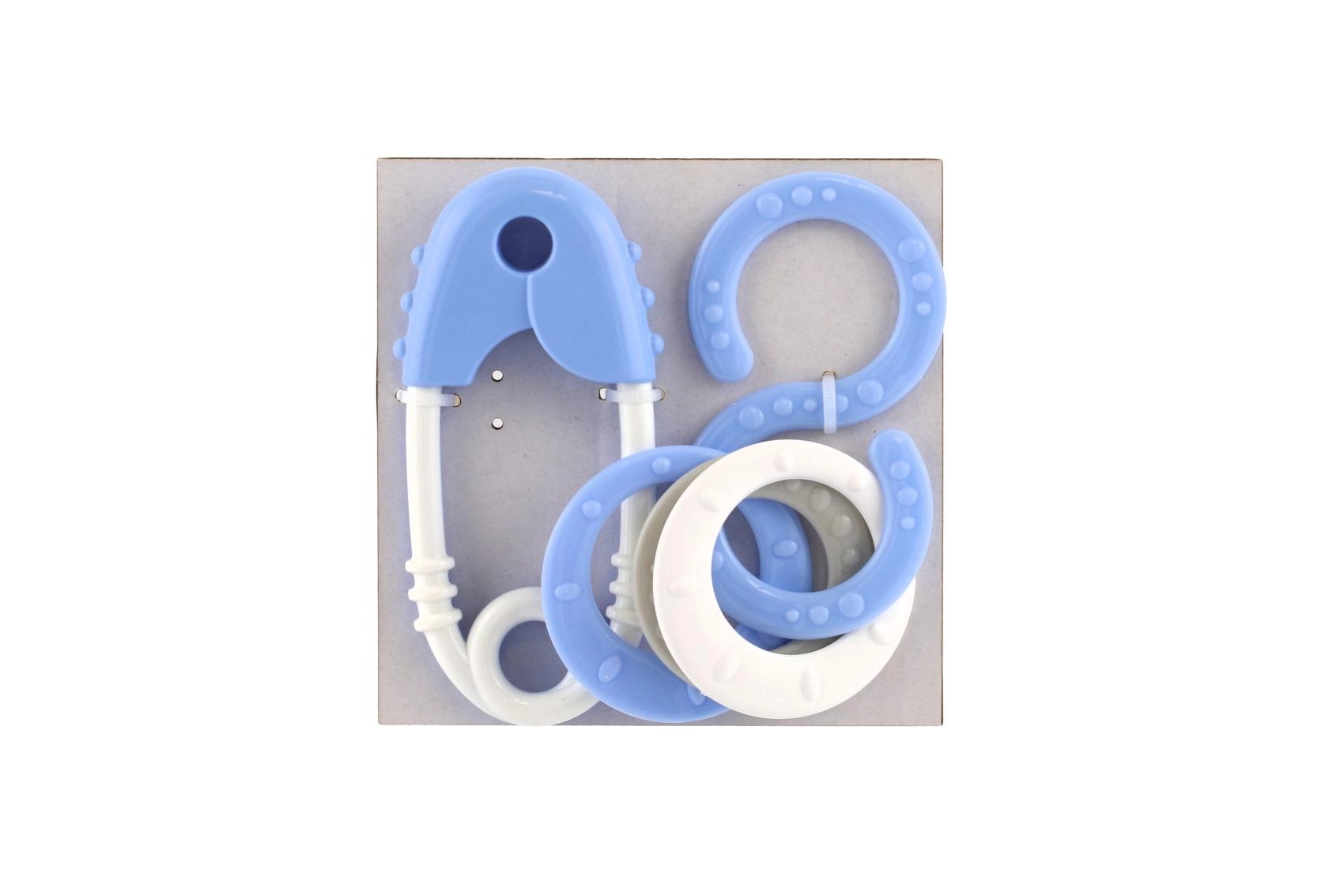 Mielas barškantis rinkinys patiems mažiausiems pastelinių spalvų derinyje sujungia segtuko ir aštuoniukės formas. Skatina jutimų raidą, lavina griebimo refleksą ir pagamintas be aštrių briaunų bei smulkių atsiskiriančių dalių.
