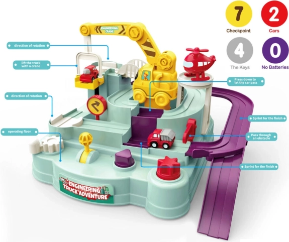 • Du automobiliukai rinkinyje: varžykitės, kas greitesnis, ir tapkite trasos čempionu.