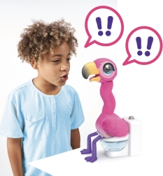 Susipažinkite su rožiniu flamingu, kuris prajuokins kiekvieną vaiką. Jis mėgsta būti maitinamas specialiu Aqua smėliu, po kurio greitai turi „užsukti“ – šis juokingas „kakojimas“ yra saugus, o smėlį galima naudoti pakartotinai. Be to, flamingas mėgsta plepėti, kartoja tai, ką girdi, ir pademonstruoja dainą bei šokį.