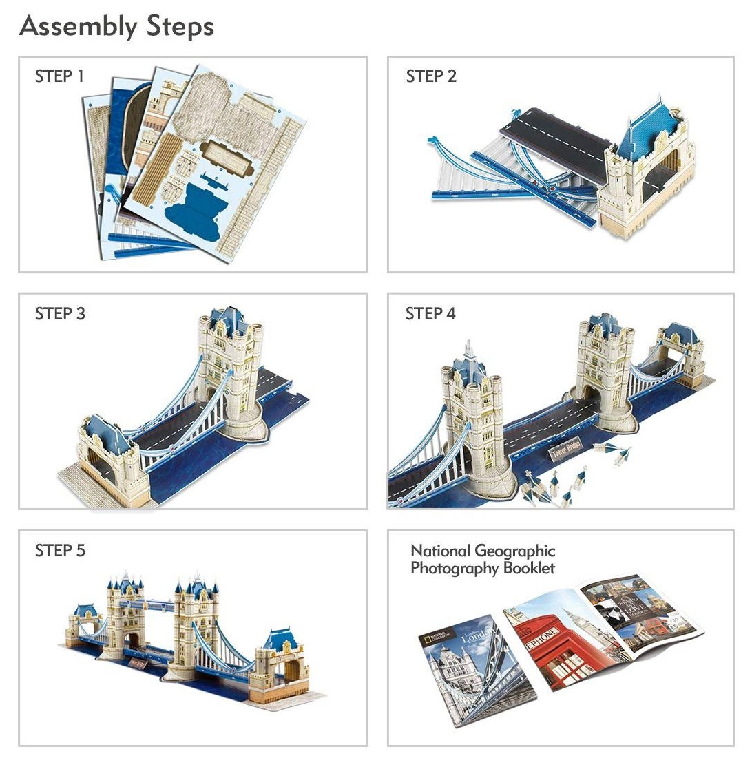Atraskite Londoną statydami vieną žymiausių jo simbolių – Tower Bridge. 3D dėlionė iš National Geographic serijos, kurią kuria CubicFun, siūlo realistišką atlikimą, tikslias detales ir malonią statymo patirtį be klijų. Maždaug 3 mm putplasčio detalės su laminuotu spauda užtikrina tvirtumą ir gražią baigto modelio išvaizdą.