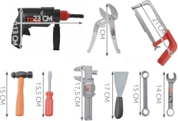 Pilnas vaikiškas įrankių rinkinys tvirtame lagaminėlyje mažiesiems meistrams nuo 3 metų. Jame yra realistiški plastikiniai įrankiai, tokie kaip gręžtuvas su besisukančiu grąžtu, pjūklas, plaktukas, atsuktuvai, replės, raktų rinkinys, slankmatis ir kiti priedai. Rinkinys lavina smulkiąją motoriką, kūrybiškumą ir moko atsakomybės žaidžiant. Lagaminėlis padeda viską tvarkingai laikyti namuose ir kelionėse.