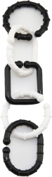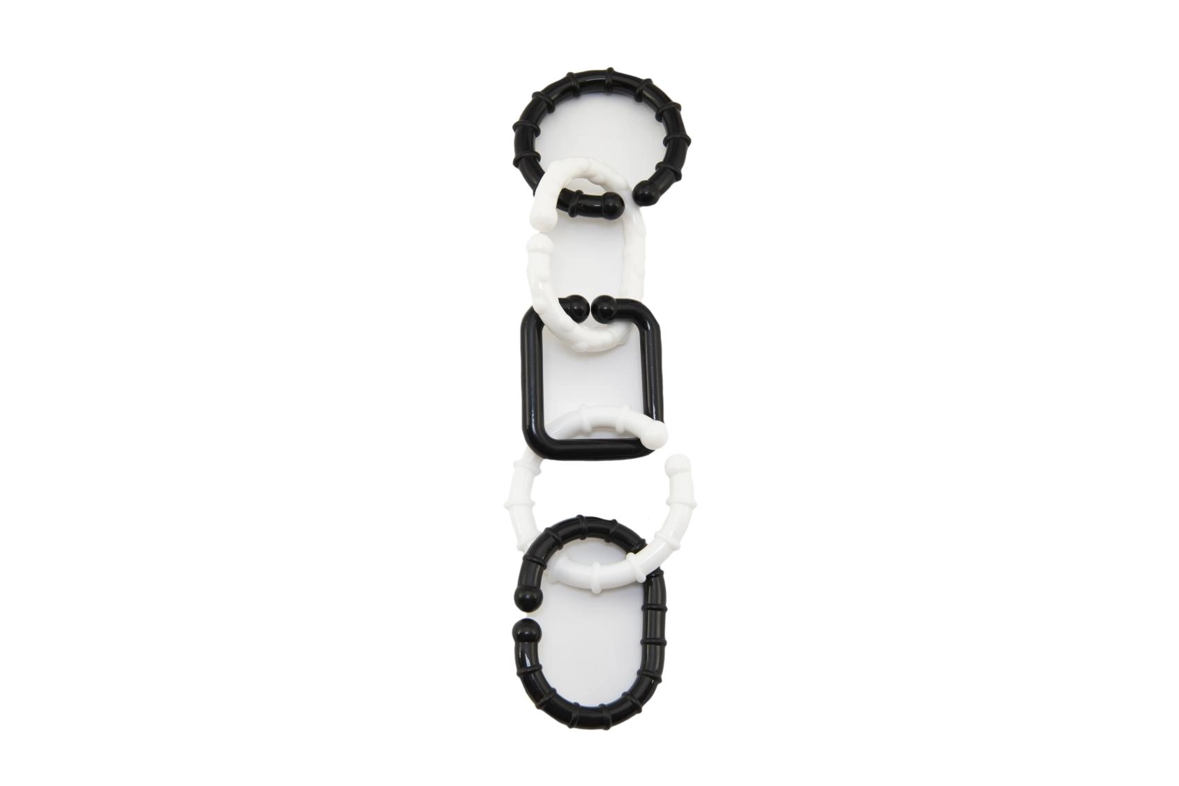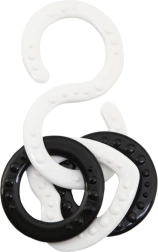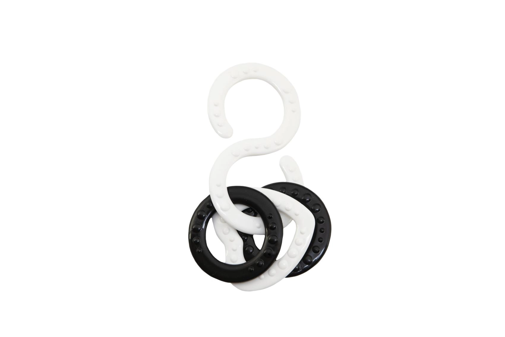 Tarpuavyje sujungiamos silikoninės akutės su reljefu masažuoja dantenas, lavina lytėjimą ir leidžia lengvai sugriebti. S formos kabliukai pritvirtina žaislus prie vežimėlio ar autokėdutės.