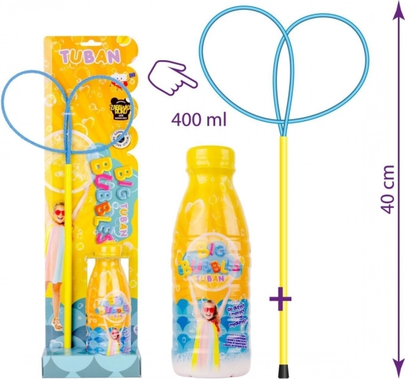 Rinkinyje yra ne tik 40 cm aukščio lankelis su plastikine rankena, bet ir speciali medžiaga, kuri sugeria skystį, kad burbulai būtų dar geresni.