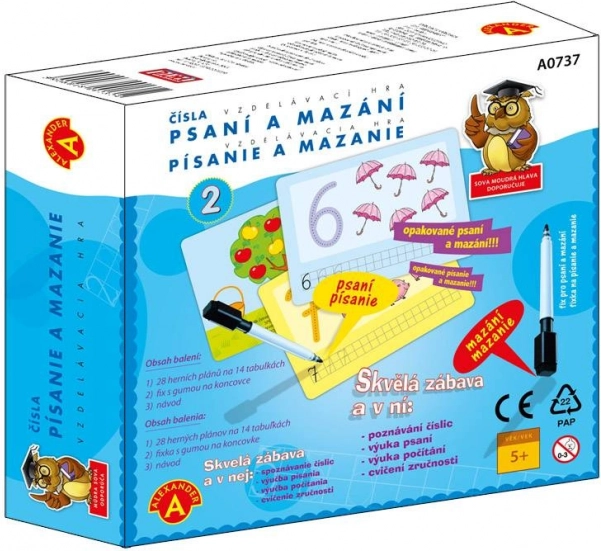 Žaidimas „Pexi rašymas ir trynimas – skaičiai“ pateikia 14 dvipusių lentelių su 28 mokomaisiais motyvais, kurie žingsnis po žingsnio veda vaikus prie užtikrinto skaitmenų 1–14 rašymo. Punktyrinės linijos palengvina formų treniruotę, o teminės iliustracijos padeda suprasti kiekius. Dėl nuvalomo paviršiaus vaikai gali lengvai taisyti klaidas ir atlikti užduotis vėl ir vėl.