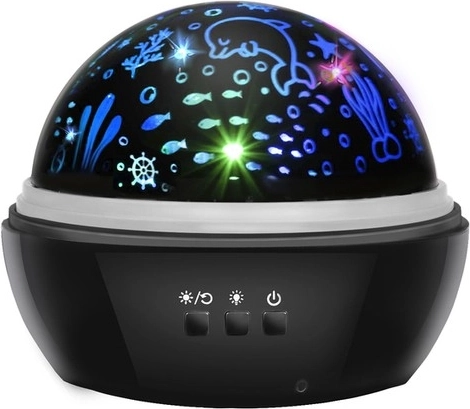 Sukamoji projekcija ir keturių spalvų (žalia, mėlyna, balta, raudona) pasirinkimas kuria įspūdingus šviesos efektus ant lubų ir sienų.