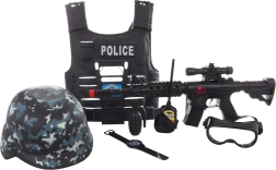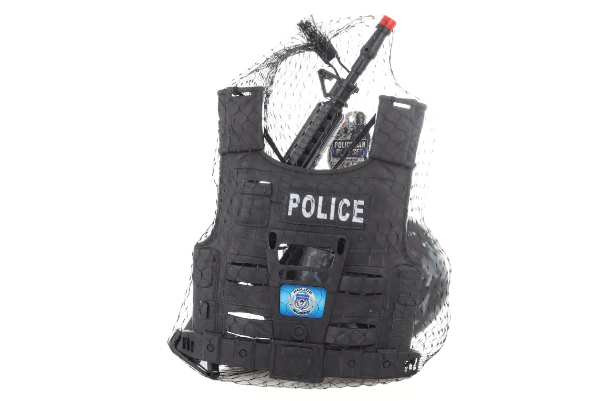 Šalmas, akiniai, racija, granata ir laikrodis sudaro visavertį policijos rinkinį. Dėl tinklinės pakuotės viskas išlieka tvarkingai vienoje vietoje.