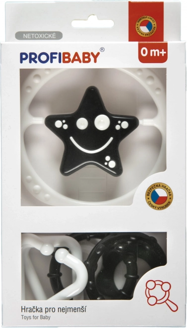 Praktiškas juodai baltas kūdikių barškučių rinkinys sujungia vežimėlio grandinėlę ir atskirą barškutį žvaigždutės arba gėlytės formos. Kontrastinės spalvos skatina vizualinį suvokimą, o švelnus garsas ir saugios formos lavina vaiko motoriką bei pojūčius. Barškučiai sukurti patogiam paėmimui ir atitinka griežtus higienos standartus. Be aštrių briaunų, be smulkių lengvai atskiriamų detalių ir idealiai tinka kasdieniam žaidimui namuose ir kelionėse.