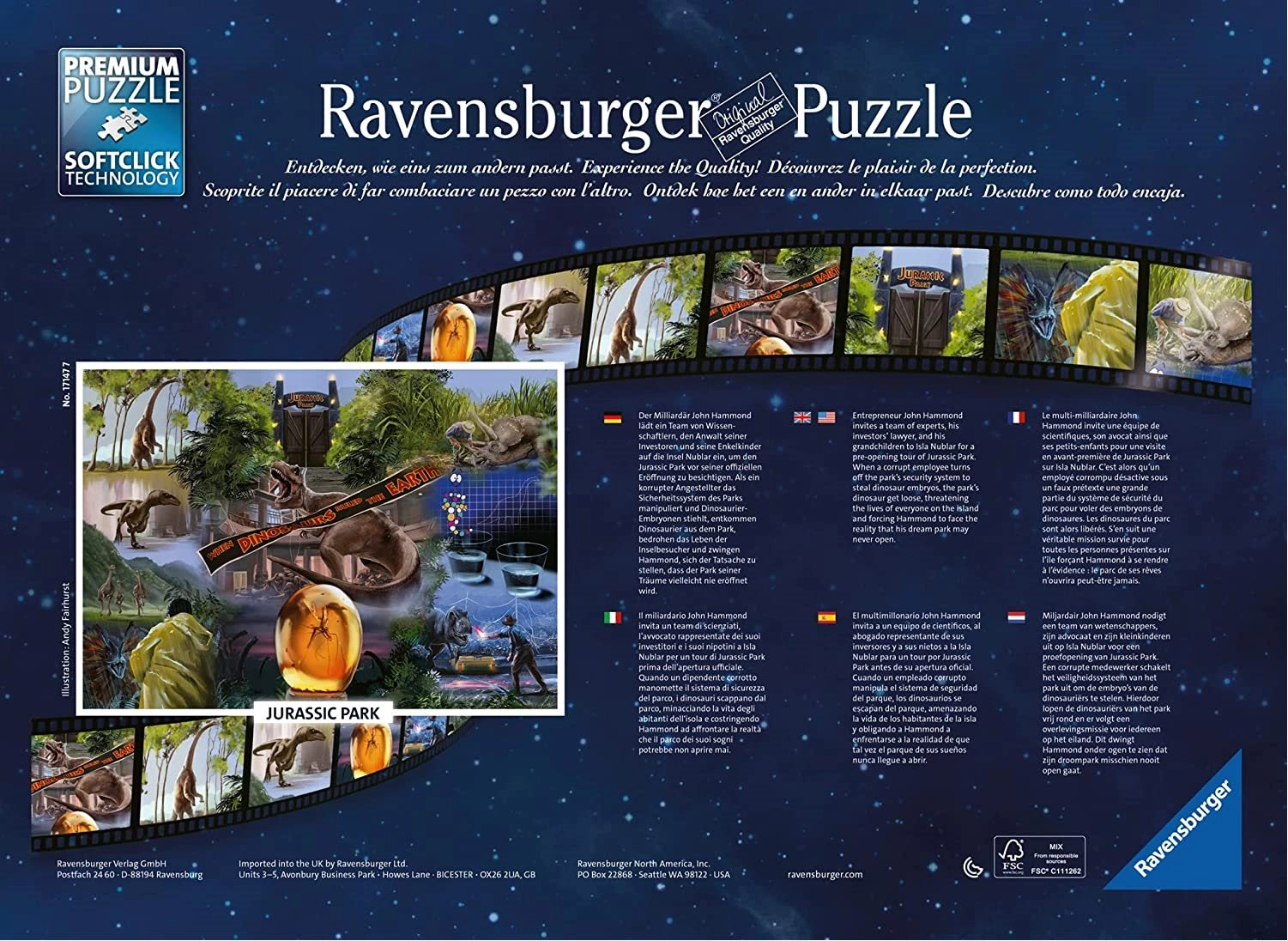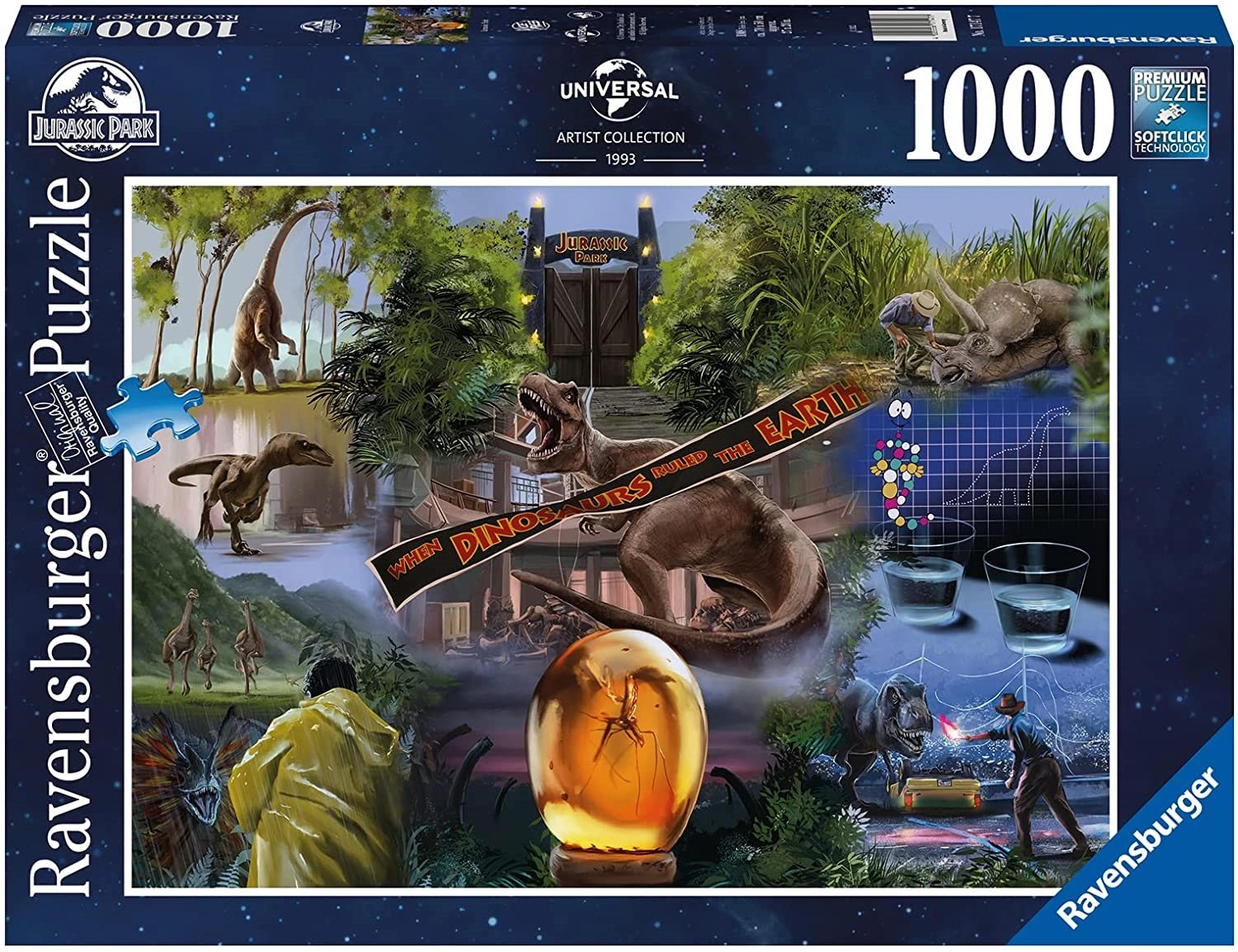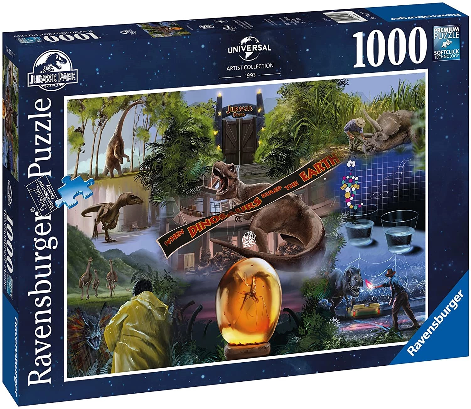 Pasileiskite į dinozaurų pasaulį su ikonišku filmo Jurassic Park motyvu. 1000 dalių Ravensburger dėlionė garsėja aukšta kokybe, tiksliomis išpjovomis ir maloniu dėliojimo pojūčiu. SoftClick technologija užtikrina, kad kiekviena detalė lengvai ir teisingai įsistatytų, o paviršius su natūralaus lino tekstūra sumažina atspindžius ir paryškina detales.
