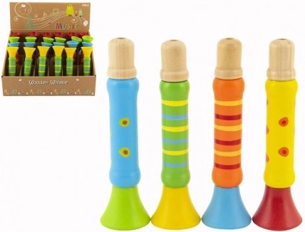 Medinis spalvotas 12 cm ilgio švilpukas – puikus pasirinkimas pirmiesiems vaikų muzikiniams bandymams. Dėl paprasto naudojimo ir malonaus garso jis natūraliai skatina klausos, ritmo ir kvėpavimo koordinacijos raidą. Galima rinktis iš kelių patrauklių spalvinių variantų.