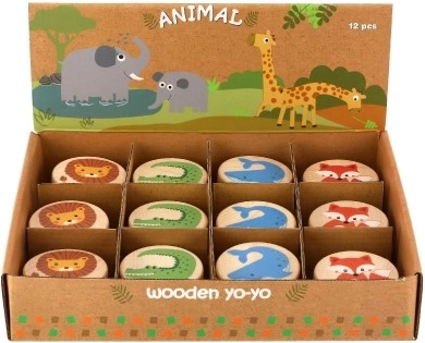 Šis 12 medinių jo-jo rinkinys siūlo nesenstančią pramogą šiuolaikiniu, linksmu stiliumi. Kiekvienas jo-jo turi lygų natūralų paviršių ir spalvotą gyvūnėlio atspaudą, kuris iškart patraukia vaikų dėmesį. Dėl patogaus 5,5 cm dydžio jį lengva laikyti ir valdyti net mažesnėmis vaiko rankomis.