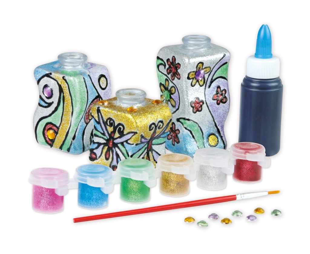 - 3 vazos, 6 žėrinčios spalvos, teptukas, dekoratyviniai akmenėliai, modeliavimo masė