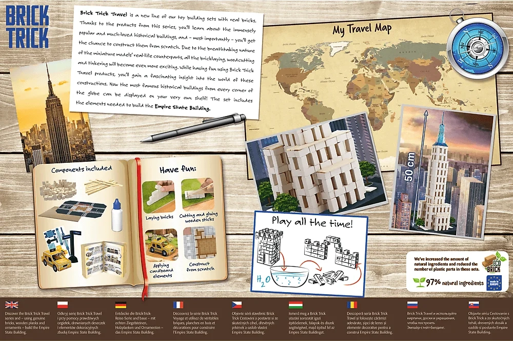 Atraskite statybų pasaulį su BRICK TRICK Travel serija ir sukurkite vieno garsiausių pasaulio pastatų modelį – EMPIRE STATE BUILDING. Plyta po plytos, pjaustydami ir klijuodami lenteles, žingsnis po žingsnio pastatysite detalų ir stabilų statinį. Galiausiai jį užbaigsite pridėtomis dekoracijomis autentiškai išvaizdai.