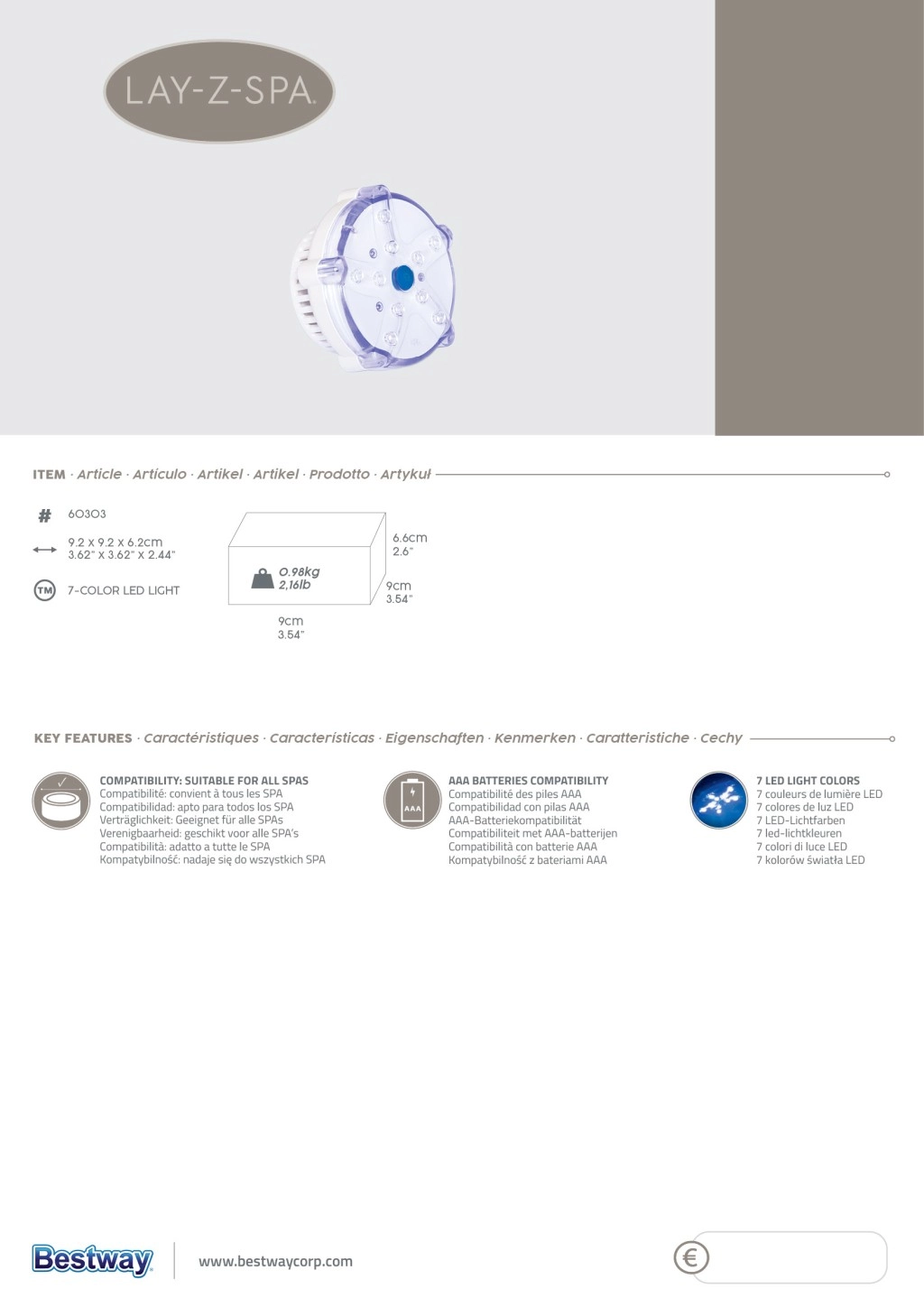 Ši Bestway LED lempa baseinui suteikia išradingą apšvietimą vandeniui, kuris kuria išskirtinę atmosferą sutemus. Dėl septynių šviesos spalvų jūsų baseinas ar sūkurinė vonia įgaus patrauklią vakarinę išvaizdą.
