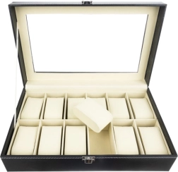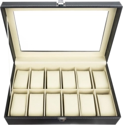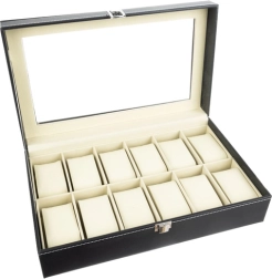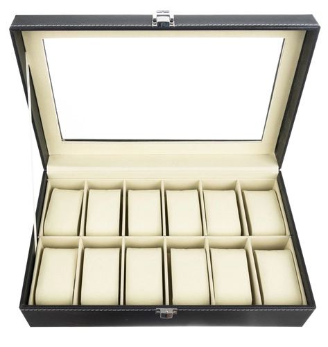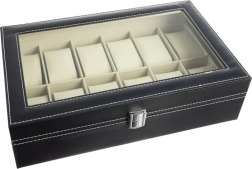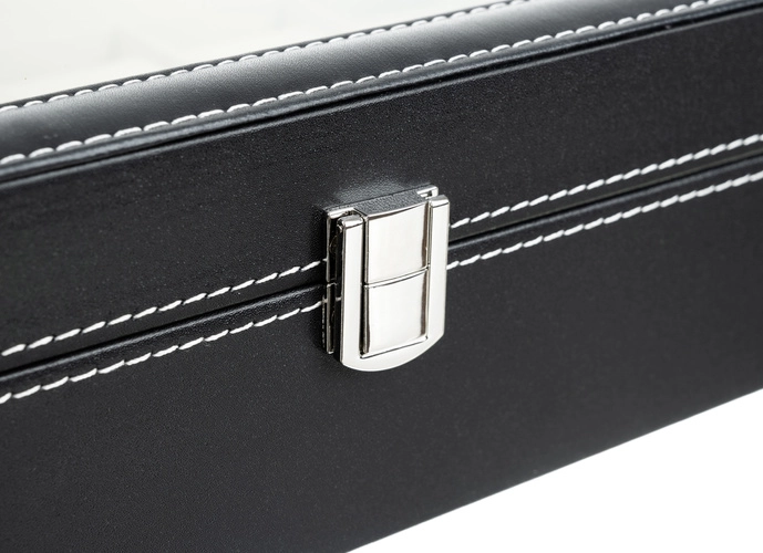 Elegantiškas laikrodžių ir papuošalų dėklas su 12 skyrelių saugiai laikys ir gražiai pristatys jūsų kolekciją. Jis turi permatomą dangtelį, juodą paviršių su kontrastiniu apsiuvimu ir minkštą paminkštinimą. Magnetinis užsegimas užtikrina turinio saugumą, išimamos pagalvėlės saugo nuo įbrėžimų ir leidžia laikyti apyrankes, vėrinius ar žiedus. Puiki dovana moterims ir vyrams bei stilingas aksesuaras bet kuriam interjerui.