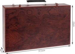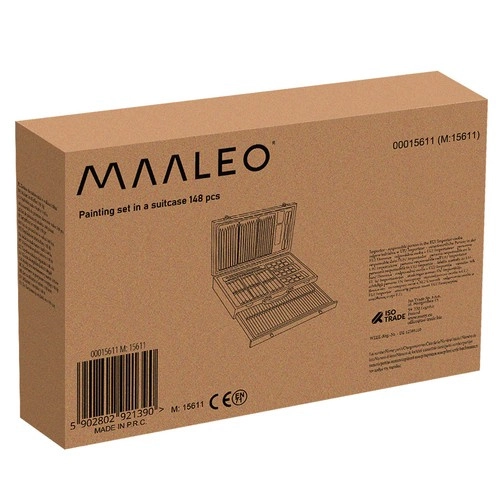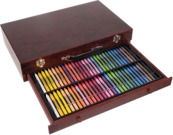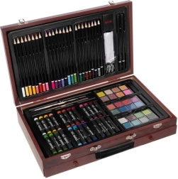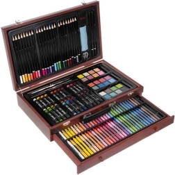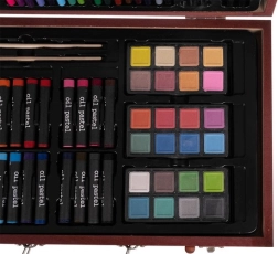 Pilnas dailės rinkinys elegantiškame mediniame lagaminėlyje su stalčiumi pradžiugins ir mažus, ir suaugusius kūrėjus. Viduje net 148 dalys: vaškinės kreidelės, aliejiniai pasteliai, spalvoti pieštukai, akvareliniai dažai, teptukai ir kiti reikmenys. Patogus lagaminėlis su rankena ir metaliniu užsegimu užtikrina lengvą nešiojimą, aiškų išdėstymą ir greitą prieigą prie visų priemonių.