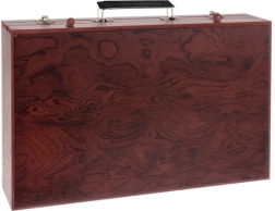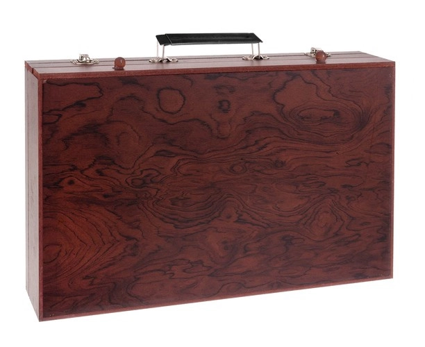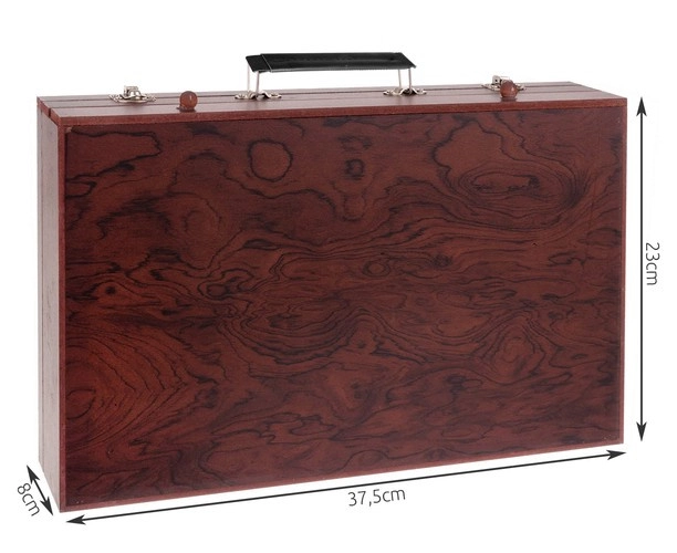 Stilingas medinis korpusas su metalinėmis sagtimis ir tvirta rankena saugo priemones ir leidžia jas saugiai transportuoti.
