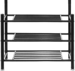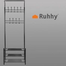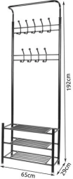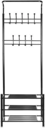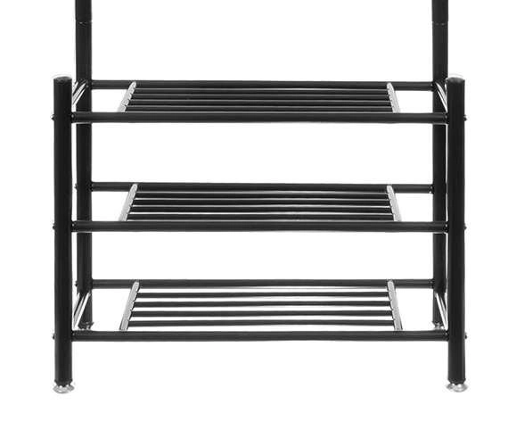 Laikykite prieškambarį ir miegamąjį tvarkingus su šia daugiafunkce drabužių kabykla su lentynomis. Ji siūlo 3 erdvias batų lentynas, 18 kabliukų paltams ir aksesuarams bei stabilią metalinę konstrukciją, kuri taupo vietą ir patikimai atlaiko kasdienį apkrovimą.