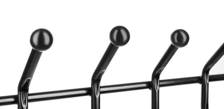 Dvi kabliukų eilės su apvaliais galiukais saugo audinius ir suteikia pakankamai vietos striukėms, paltams, šalikams, kepurėms ir rankinėms.