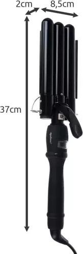Ši triguba garbanojimo žnyplė su 22 mm volelių skersmeniu akimirksniu sukuria tolygias, natūralias bangas – tereikia įstatyti sruogą, prispausti ir perkelti toliau. Keraminis PTC kaitinimo elementas užtikrina greitą ir tolygų įkaitimą bei švelnų kontaktą su plauko stiebu be nereikalingo perkaitinimo.