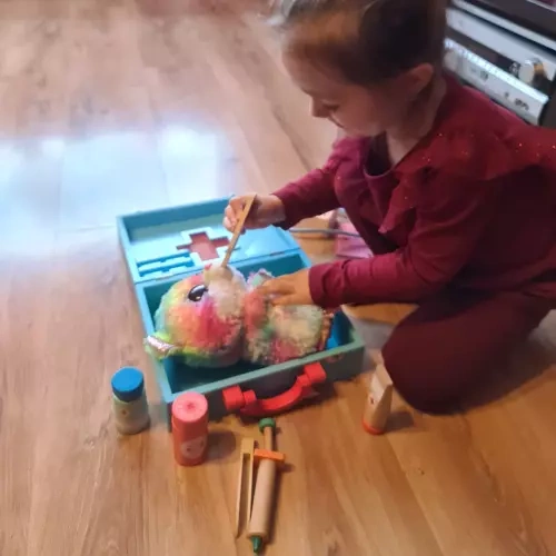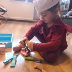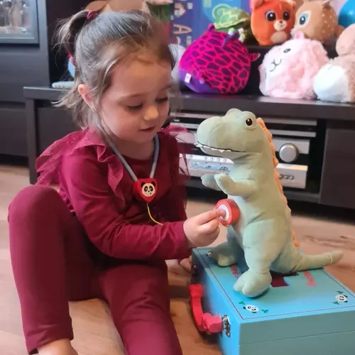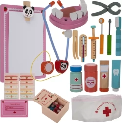 Šis išsamus medicininis ir odontologinis rinkinys tvirtame mediniame lagaminėlyje siūlo vaikams realistiškas priemones apžiūroms ir dantukų priežiūrai. Dėl patogaus išdėstymo ir plataus įrankių spektro vaikai natūraliai mokosi atpažinti formas, spalvas ir medicinines procedūras per žaidimą.
