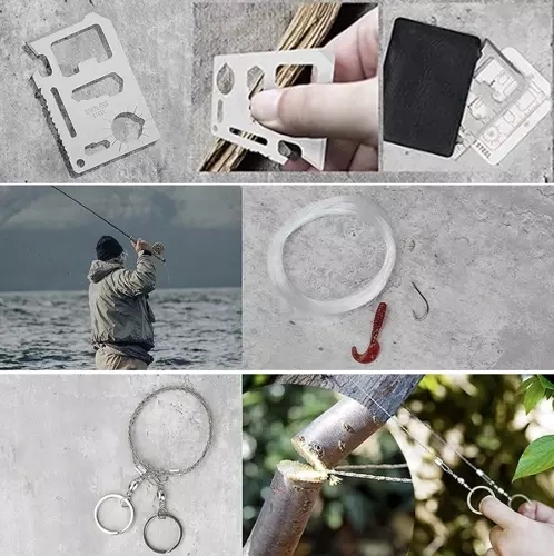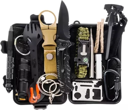 - lenkiamas peilis su pjūkleliu ir virvių pjaustytuvu, taktinis rašiklis, 11 viename išgyvenimo kortelė, skeltuvas su magnezio lazdele ir brauktuku su liniuote bei atidarytuvu, žibintuvėlis, termo folija 130 × 210 cm, užsegamas konteineris, butelio laikiklis diržui, paracord apyrankė (apie 3,5 m virvės) su kompasu, švilpuku ir skeltuvu, silikoniniai masalai 2 vnt + valas + 2 kabliukai, valgymo įrankis (šaukštas/šakutė su atidarytuvu + peiliukas), sulankstomas švilpukas, uždegimo virvelės 2 vnt, karabinai 2 vnt, vielinis pjūklas apie 60 cm