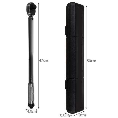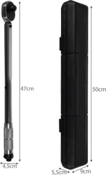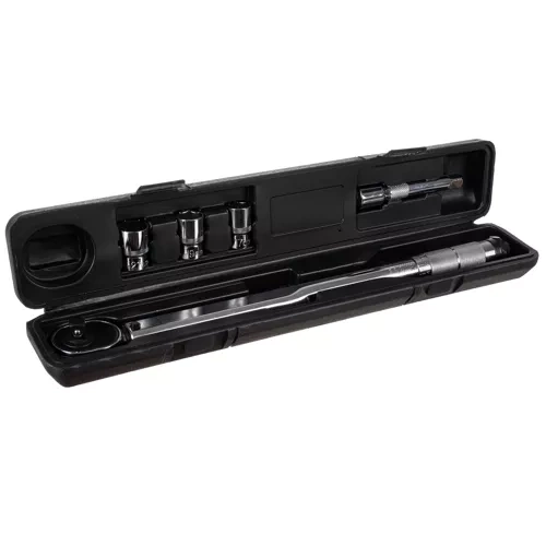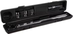 Tvirtas 1/2" sukimo momento raktas su terkšle ir 17/19/21 mm antgalių rinkiniu bei prailginimu, skirtas tiksliam varžtinių jungčių priveržimui ir atlaisvinimui. Siūlo 28–210 Nm momento diapazoną, dvikryptį dešinės/kairės eigos režimą, LOCK/UNLOCK užraktą ir praktišką apsauginį dėklą saugiam laikymui. Idealiai tinka šešiakampiams ir kvadratiniams varžtams, kabliams ir motociklų veržlėms.