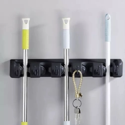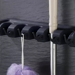 Universalus sieninis įrankių laikiklis siūlo patogų ir stabilų sprendimą įvairių valymo įrankių, tokių kaip šluotos, mopai, kastuvai ar skudurai, laikymui.