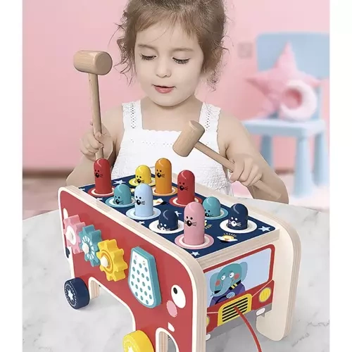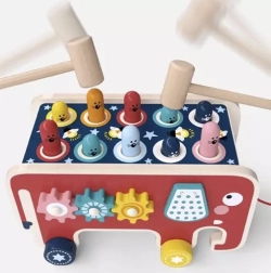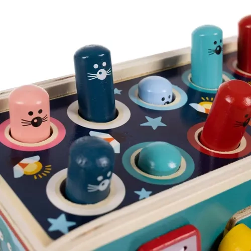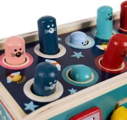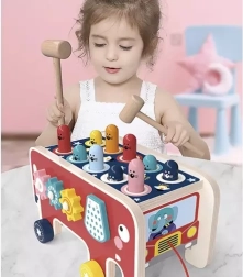 Šis žaislas skatina smulkiosios motorikos ir susikaupimo lavinimą dėl interaktyvių elementų, tokių kaip plaktukai ir krumpliaračiai.