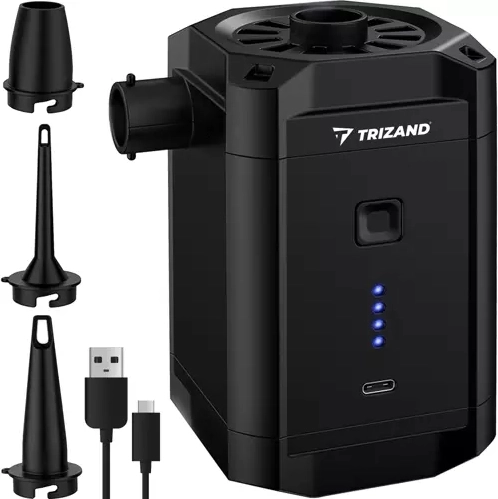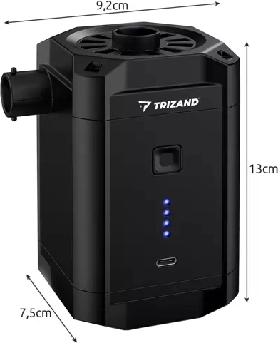 Belaidė akumuliatorinė Trizand pompa – naudingas pagalbininkas kiekvienoje kelionėje. Dėka trijų keičiamų antgalių ji puikiai tinka pripūsti čiužinius, kamuolius, pontonus ir kitus pripučiamus daiktus. Kompaktiška ir lengvai nešiojama, todėl yra puikus palydovas stovyklaujant ar paplūdimyje.