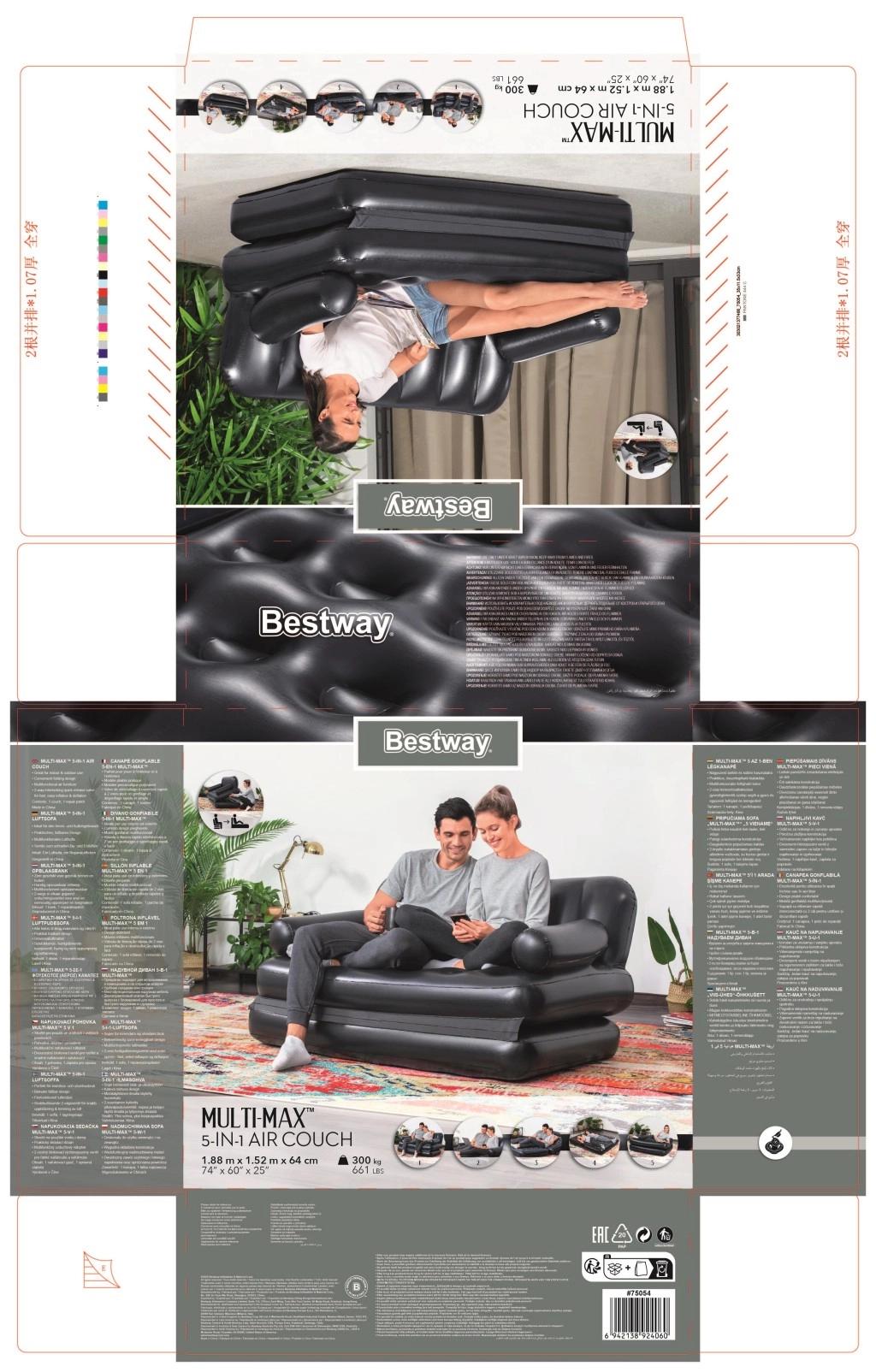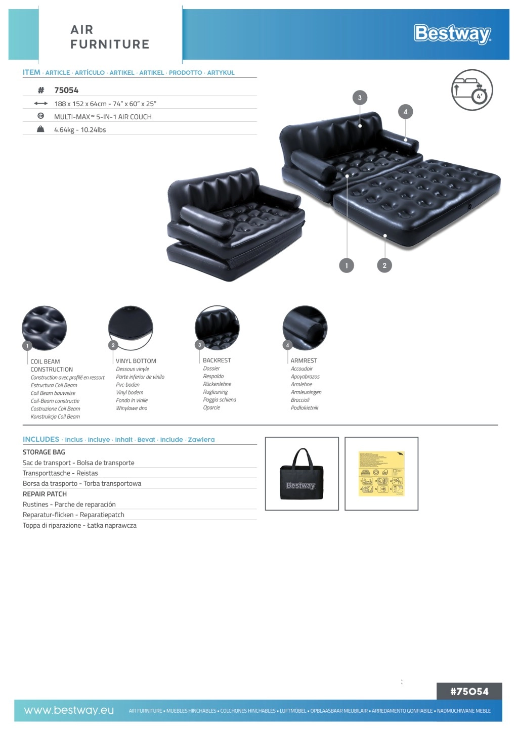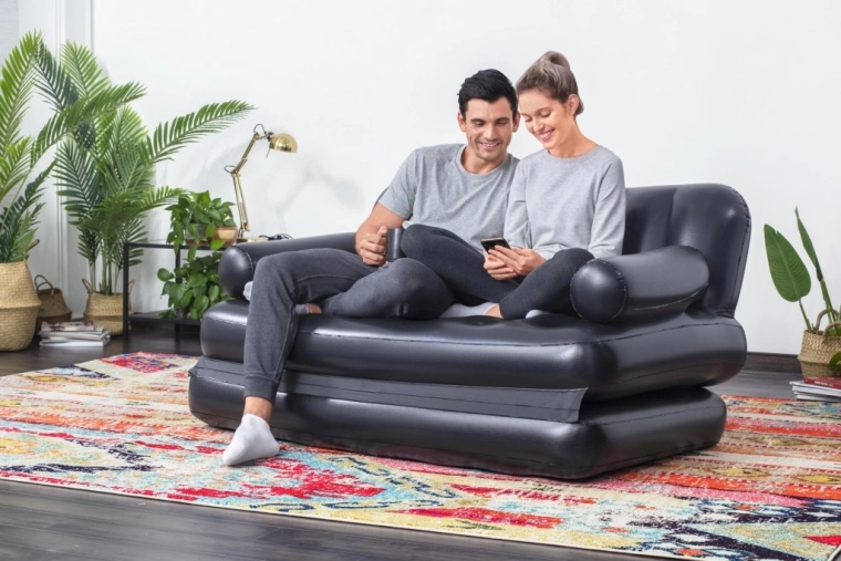 Universalus pripučiamas 5‑i‑1 fotelis-sofa ir lova iš BESTWAY siūlo patogią sėdimą vietą ir miegą dviem. Dėl patvaraus PVC, stabilios Coil Beam konstrukcijos ir greito išleidimo vožtuvo ją lengvai pripūsite, paversite gultu ar dvigule lova ir po naudojimo greitai išleisite. Idealu naudoti patalpose, svečiams ir laikinam miegui.