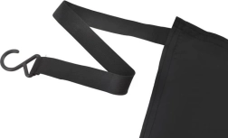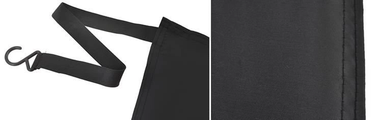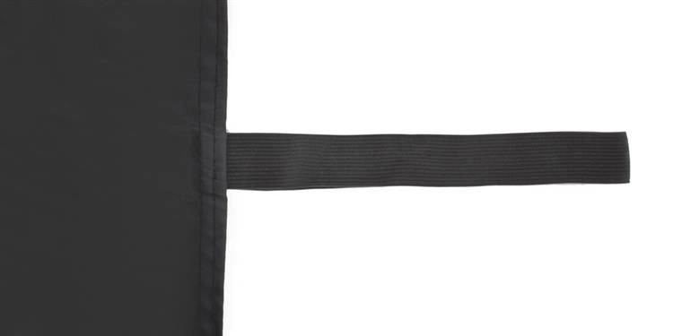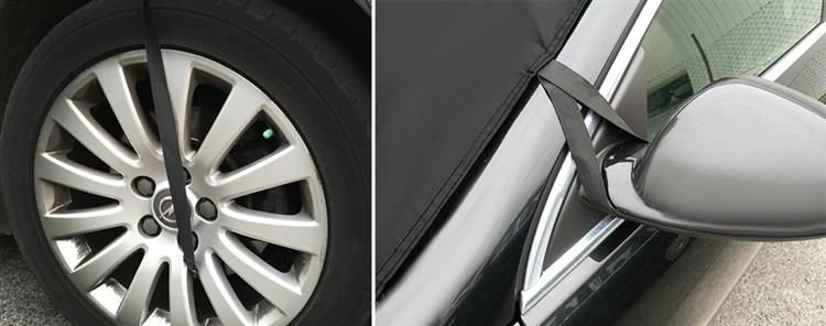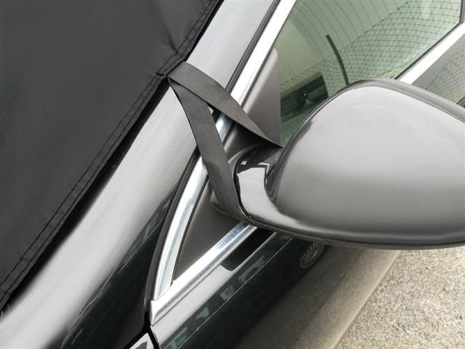 Elastiniai dirželiai su kabliukais tvirtinami prie veidrodėlių ir ratų, kraštus papildomai prispaudžia durelės. Skydelis priglunda prie stiklo ir atsparus vėjui.