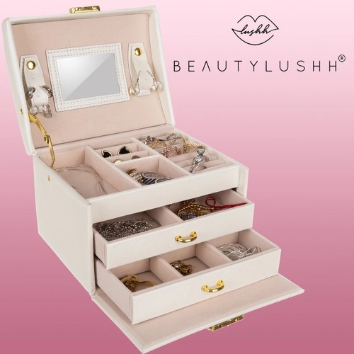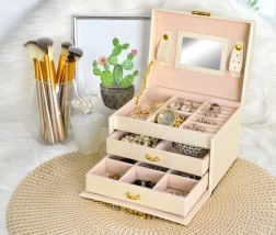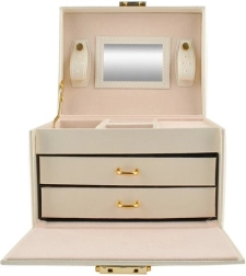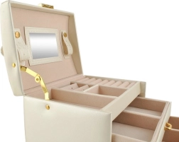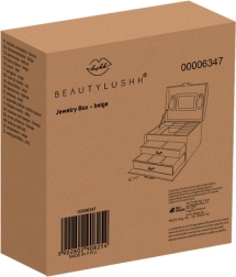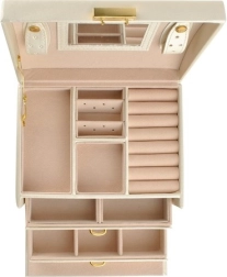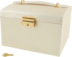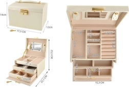 Elegantiška smėlio spalvos papuošalų dėžutė su satiniu paviršiumi siūlo net 20 skyrelių, 2 stalčiukus ir patogias žiedų ritinėles. Vidiniame dangtelyje yra veidrodėlis ir dirželiai su užsegimu grandinėlėms ar apyrankėms. Dėl užrakinimo raktu jūsų papuošalai bus saugūs, o švelnus apmušalas papildomai saugo nuo įbrėžimų. Auksiniai akcentai pabrėžia laiko nepavaldžią eleganciją, o dėžutė puikiai tinka tiek namuose, tiek kelionėse.