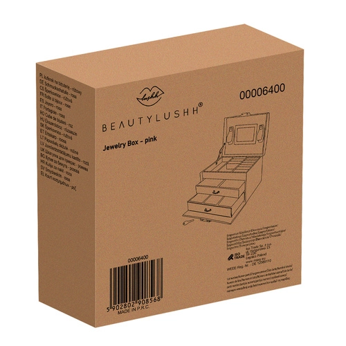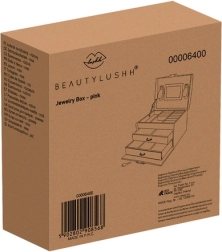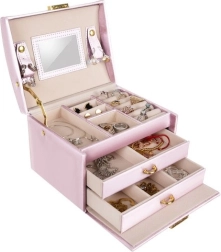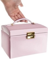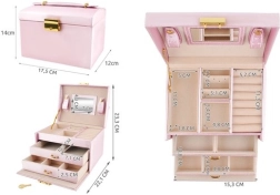 Elegantiška rožinė papuošalų dėžutė su 20 skyrelių, 2 stalčiukais ir užraktu su raktu saugiai ir tvarkingai laikys jūsų brangenybes. Ji turi minkštą pamušalą nuo įbrėžimų, patogias žiedų ritinėles, dirželius su kniedėmis apyrankėms ir grandinėlėms, integruotą veidrodėlį ir viršutinę rankeną lengvam nešiojimui.