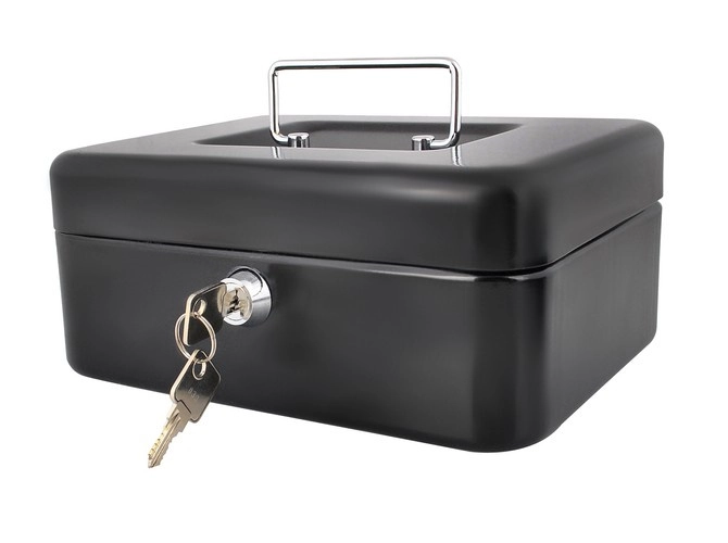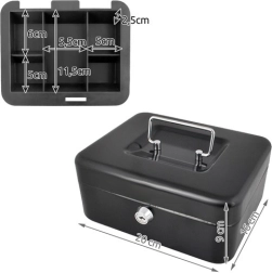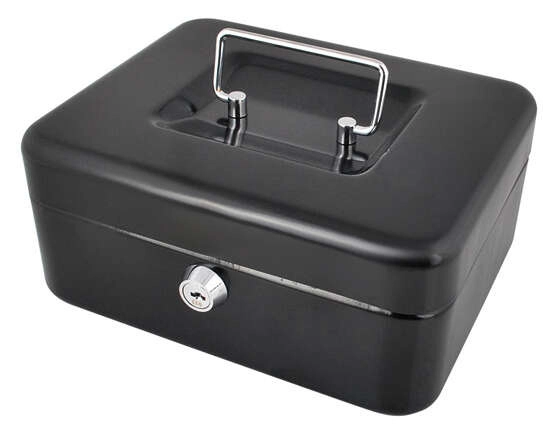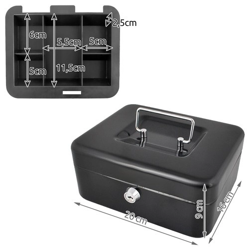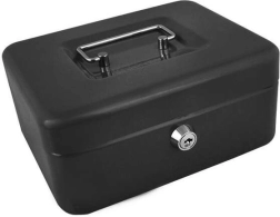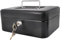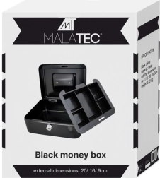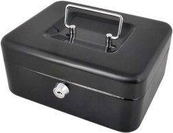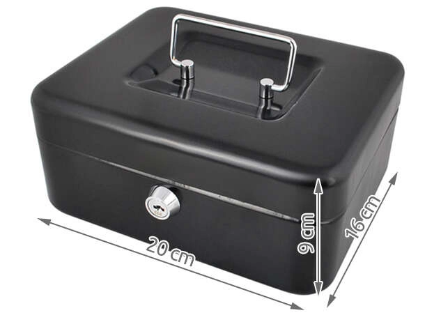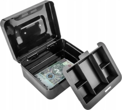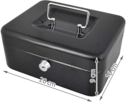 Praktiška metalinė pinigų dėžutė ISO TRADE elegantiškos juodos spalvos saugiai laikys grynuosius ir smulkias vertybes. Ji siūlo spyną su raktu, išimamą monetų dėklą su paslėpta erdve po juo ir tvirtą metalinę konstrukciją su patogia nulenkiama rankena. Kompaktiški matmenys 20 × 16 × 9 cm tinka namams, biurui ir viešbučio kambariui.
