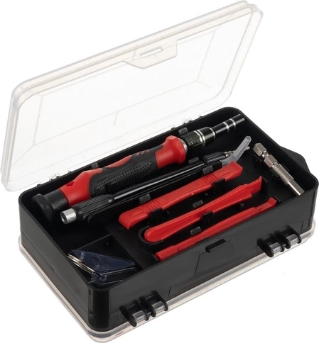 Magnetizatorius/demagnetizatorius, smailus pincetas ir siurbtukas stiklui padeda saugiai išardyti jautrius įrenginius jų nepažeidžiant.