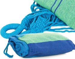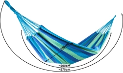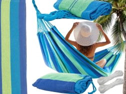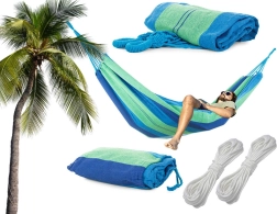 Šis dryžuotas hamakas – idealus pasirinkimas sodui, terasai, balkonui ir net vidaus erdvėms. Dėl kvėpuojančio medvilnės ir poliesterio mišinio jis malonus liesti, patvarus ir lengvai prižiūrimas. Per akimirką pakabinsite tarp dviejų medžių ar ant stovų ir mėgausitės ramiu supimusi.