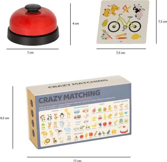 Dėžutėje yra 54 kortos ir raudonas skambutis, suteikiantis žaidimui dinamikos ir pramogos. Spalvingos kortelių iliustracijos patiks tiek vaikams, tiek suaugusiesiems ir lavins jų refleksus bei pastabumą.