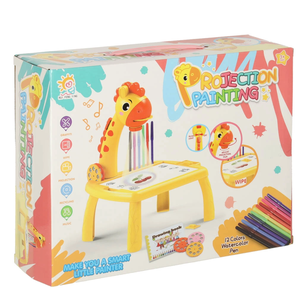 Atraskite smagų būdą, kaip išmokyti vaikus piešti! Geltonas žirafos projektorius projektuoja vaizdus ant popieriaus, kad vaikai galėtų juos apibrėžti. Rinkinyje yra spalvoti flomasteriai, trys keičiami diskai su motyvais ir valomas pagrindas. Puiki priemonė ugdyti kūrybiškumą, smulkiąją motoriką ir tikslumą – idealiai tinka vaikams nuo 3 metų.