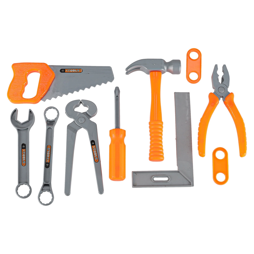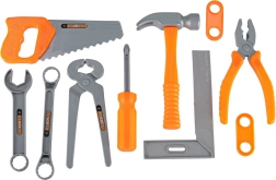 Plaktukas, pjūklelis, replės, raktai, atsuktuvai, konstrukcinės detalės bei varžtai ir veržlės – viskas saugiam sukimui, pjovimui ir surinkimui.