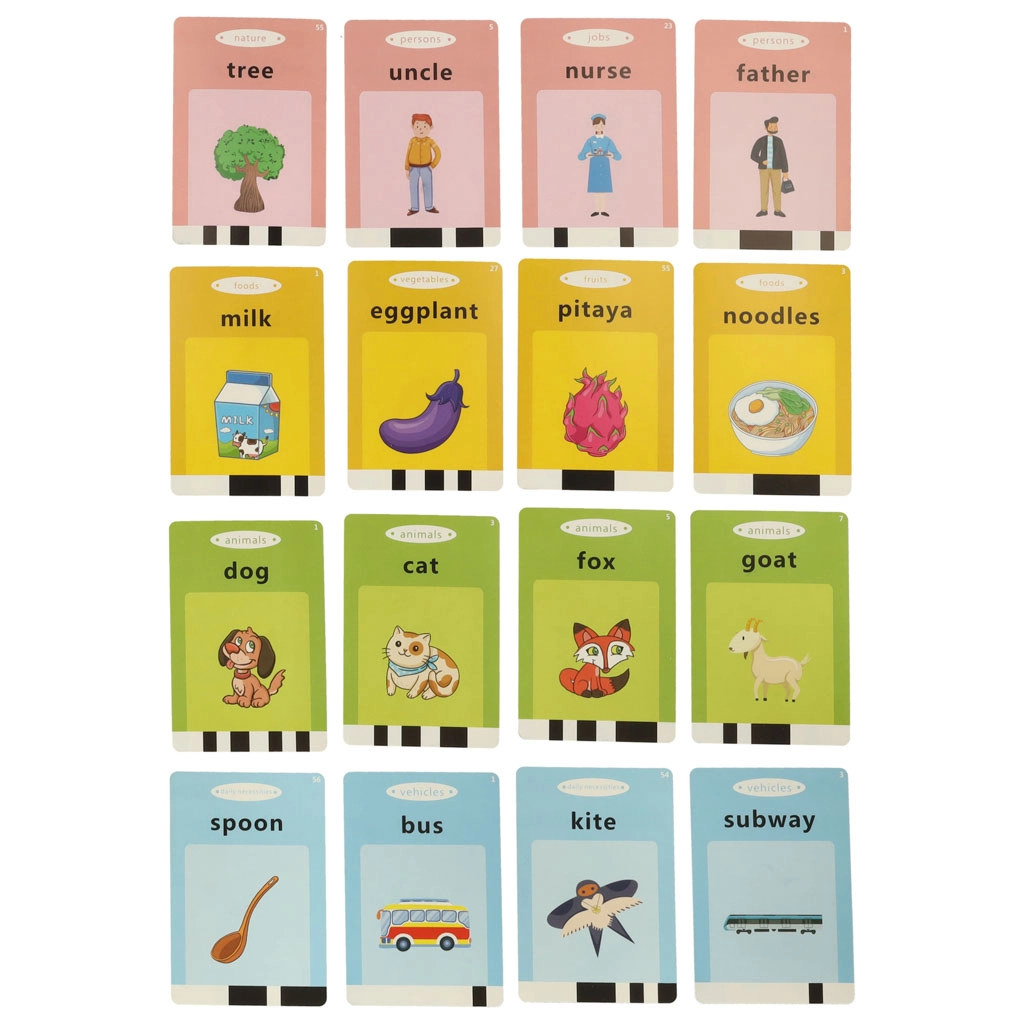 Kortelės suskirstytos į aiškias spalvotas kategorijas – maistas ir vaisiai/daržovės (geltona), šeima, spalvos, profesijos, drabužiai, gamta (violetinė), gyvūnai (žalia) ir transportas bei daiktai (mėlyna). Kiekviena kortelė yra dvišalė su dviem žodžiais, todėl mokymasis įvairus ir efektyvus.