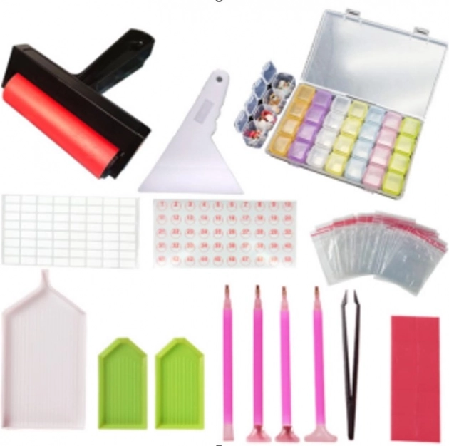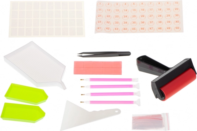 Rinkinio turinys: Volelis, 2 standartinės lėkštelės, 1 didelė lėkštelė su piltuvėliu, 4 rašikliai, 1 pincetas, lipdukai, 1 mentelė, kristalų separatorius, 20 maišelių su užtrauktuku. Viskas supakuota į maišelį su užtrauktuku.